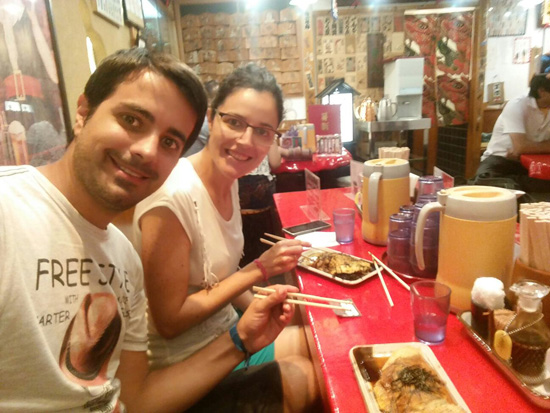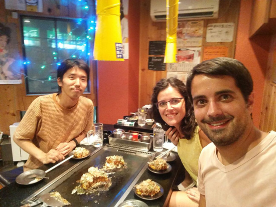 Algo desilusionados regresamos a la estación e invitamos a cenar a Ryosuke, nuestro nuevo amigo, que nos enseña un local donde suele comer la gente más joven. El restaurante es bastante pequeño y tiene varias mesas con planchas donde nos preparan okonomiyaki, una especie de pizza a la que se le puede añadir los ingredientes que se quiera.