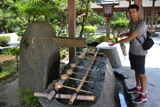 Como es temprano y aun no podemos coger la habitación, dejamos las maletas en las taquillas de la estación de Kyoto y nos sacamos un bono de bus de 24h para empezar a ver cosas. Hoy hemos decidido irnos a las zonas más alejadas del centro, empezando por el templo Kamigamo, uno de los 17 sitios patrimonio de la humanidad que hay en esta ciudad, donde empezamos a familiarizarnos con las costumbres japonesas, como lavarse las manos y beber algo de agua de los pozos que hay en las entradas de templos y santuarios para purificarse.