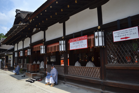 La primera visita del día es Shimogamo Jinja, templo gemelo a Kimogamo. Al llegar encontramos que se está celebrando una ceremonia, lo que nos permite contemplar durante un buen rato a los monjes rezando. Visitamos el resto del recinto mientras acaban, ya que no se puede acceder al templo principal durante la misma.