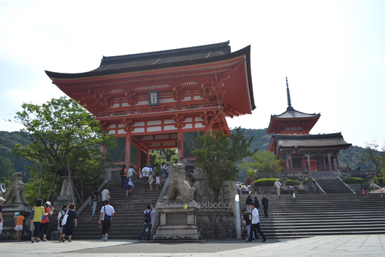 De ahí nos dirigimos a Kiyomizudera, uno de los templos más bonitos de Japón. Enclavado en una montaña y con unas vistas impresionantes de Kyoto, ya las calles por las que nos aproximamos son dignas de ver. El templo nos recibe con una gran puerta de madera pintada de naranja y blanco y unas escaleras que nos llevan hasta una pagoda de 3 pisos y el enorme templo de madera suspendido entre la propia montaña y una estructura de columnas de unos 13m que forman una terraza enfrente del salón principal.