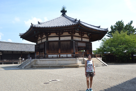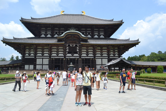 Después de hacernos mil fotos, nos dirigimos al templo Todaiji, probablemente el más visitado de la ciudad, y pronto entendemos por qué. Tras pasar la enorme puerta nos quedamos con la boca abierta con el aún más inmenso edificio de madera que forma el templo, en cuyo interior se encuentra el Buda más grande de todo el país. De hecho, hemos leído en la guía que se trata del edificio de madera más grande del mundo y que en realidad se trata de una reconstrucción del s. XVII que “solo” tiene dos tercios del tamaño original.