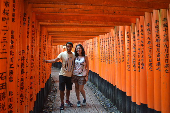 En tren nos desplazamos hasta Fushimi Inari, uno de los templos más conocidos internacionalmente por sus numerosos toriis que ascienden en la montaña pasando por varios templos y santuarios, y que han sido escenario de películas tan conocidas como Memorias de una Geisha. Sin embargo, nada más llegar empieza a diluviar por lo que no tenemos más remedio que refugiarnos en el alero de un templo. Tras varias horas de espera, y viendo que la lluvia no da tregua y que empieza a hacerse tarde, decidimos internarnos bajo la protección de un paraguas para, al menos, ver algo. El paseo no dura mucho ya que ni con paraguas evitamos calarnos, así que empapados y algo tristes por no haber podido ver mucho del templo, regresamos en tren a Kyoto.