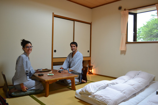 Ya en el hostal, tras un baño en el onsen y una cena que nada tiene que ver con nuestra increíble comida, disfrutamos de la sobremesa intercambiando experiencias y detalles con otra pareja de viajeros españoles que vienen de la zona de Tokio.