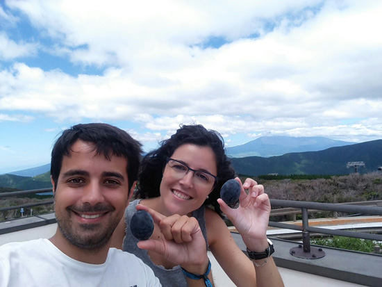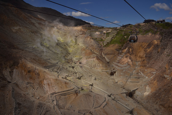 El Hakone Tozan Railway, el tren de montaña más antiguo de Japón, nos lleva por un bonito recorrido hasta Gora, donde cogemos el teleférico hasta Owakudani. Esta zona volcánica, una de las más activas del parque, está llena de cráteres y fumarolas que inundan de vapores apestosos toda la montaña. De hecho, algunos senderos se encuentran actualmente cerrados al público por riesgo de intoxicación. Desde aquí hay unas de las mejores vistas del Monte Fuji y sus impresionantes 3.776m. Como la cima está tapada con nubes, cosa bastante frecuente, decidimos hacer tiempo a ver si se despeja mientras probamos unos huevos cocidos en las fumarolas, que les da un característico color negro.