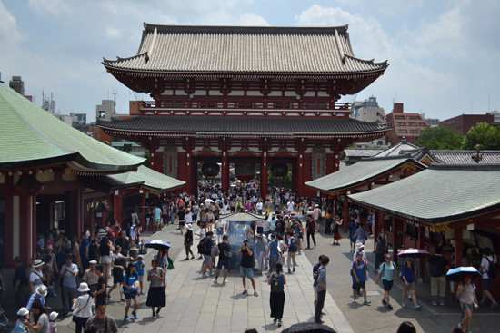 Después de dejar las zapatillas, ya oliendo a detergente, en nuestro apartamento, nos desplazamos hasta el barrio de Akasusa. La parada del metro nos deja justo enfrente de la puerta Kaminarimon, con una de las linternas más grandes de Japón. Desde ahí se extiende la avenida Nakamise, una calle larga y abarrotada de pequeñas tiendas de comida y suvenires para turistas. Avanzamos despacio por la enorme cantidad de gente que se agolpa en los puestos, hasta llegar al bonito templo Sensoji, el más antiguo de Tokio.