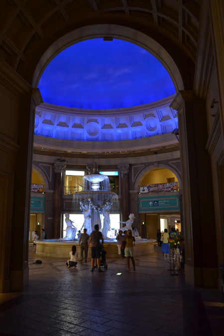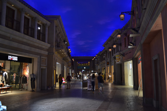 Curioseamos dentro del edificio, donde hay varias exposiciones de series, programas, películas y manga de producción propia. Desde ahí nos acercamos al Venus Fort, unos de los muchos centros comerciales que hay en Odaiba. Este es particularmente interesante porque las calles del Centro simulan calles de una ciudad italiana del s. XVIII, con techos pintados haciendo el efecto de un cielo al anochecer, tiendas con fachadas de columnas corintias, puertas que son arcos y plazas con enormes fuentes. Muy del estilo al casino Venetian en Las Vegas.