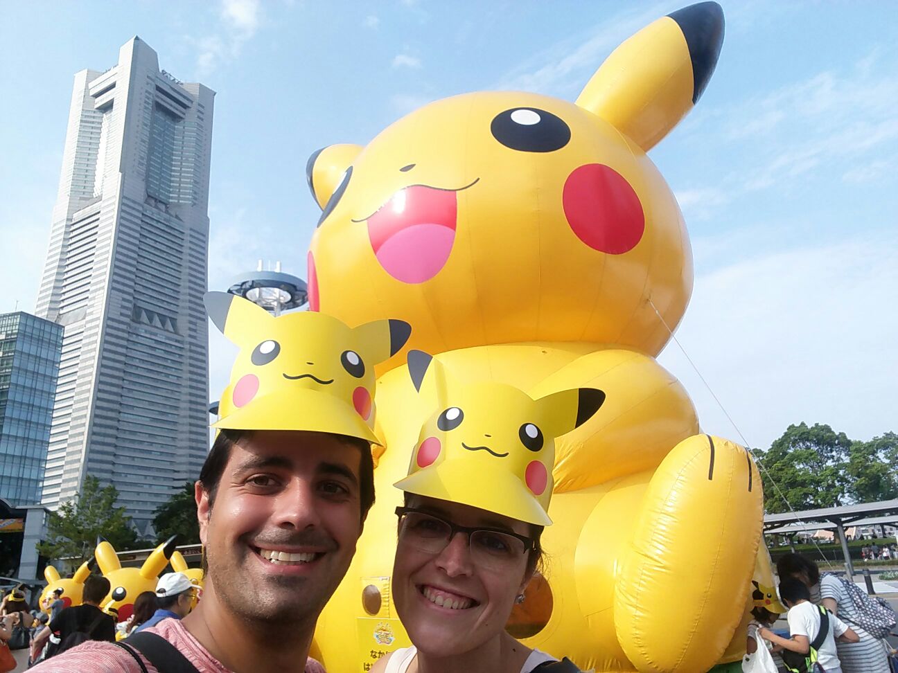 Nada más bajarnos del tren nos topamos con una avalancha de pikachus: gente repartiendo gorras de pikachu, decenas de figuras hinchables de pikachu, gente disfrazada de pikachu, un musical callejero de pikachu… pero esto que es??