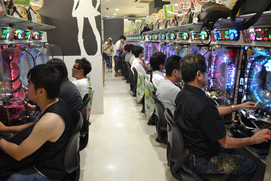Aquí también podemos ver el pachinko, un juego de difícil comprensión para unos profanos como nosotros. Solo vemos cientos de pequeñas bolas metálicas que suben y bajan por un sistema de canales y puertas al estilo pinball. El jugador va girando una ruleta que dirige la dirección de las bolas y, según caigan, reciben puntos y más bolas. En Akihabara hay muchísimas salas repletas de máquinas de pachinko, que son dignas de ver. Es increíble la cantidad de gente que juega, el ruido es indescriptible y sorprende que se pueda fumar, por lo que todo está lleno de humo.