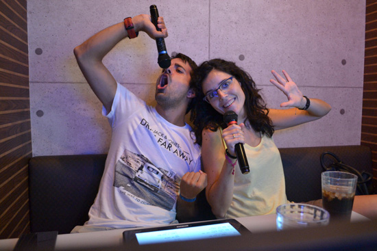 Pero la despedida de Japón la queremos hacer con una de las actividades más populares y divertidas del país: un karaoke. Por esta zona hay muchísimos, así que nos decidimos por Utahiro, que ofrece 3 pisos de pequeñas habitaciones a un buen precio. El recepcionista nos explica cómo funciona: se reserva por medias horas y, además de la sala, tenemos acceso a una pequeña estancia común con refrescos que podemos usar las veces que queramos. Así, pagamos 1h y nos acompaña a una pequeña sala con una mesa, dos micrófonos, una tele y la consola desde donde se eligen las canciones.