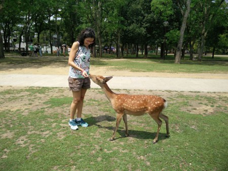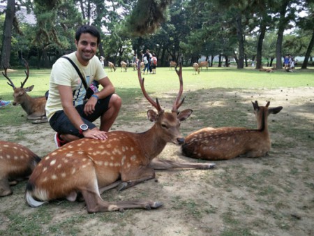 De ahí volvemos a coger el tren y luego un bus al centro de Nara. Nada más bajarnos del bus nos vemos rodeados de ciervos que se acercan para que los acariciemos y les demos algo de comer, y es que el Nara Park está abarrotado de estos simpáticos animales. Tumbados a la sombra, en medio de las calles, persiguiendo a algún turista, dentro de las tiendas… por todos lados!!!