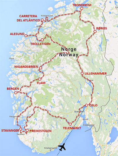 Ruta circular de 3.300km con salida y llegada en Oslo. De camino visitamos varias ciudades, como la propia Oslo, Bergen, Trondheim, Ålesund o Lillehammer, navegamos por fiordos, como Sognefjord, Nordfjord, Aurlandsfjorden, Nærøyfjord o Lysefjord, recorremos los Parques Nacionales de Jotunheimen y Rondane y el glaciar de Nigardsbreen, conducimos por la Carretera de los Trolls y la Carretera del Atlántico, completando el viaje con dos de los treckings más famosos de Noruega... Preikestolen y Kjerabolten.